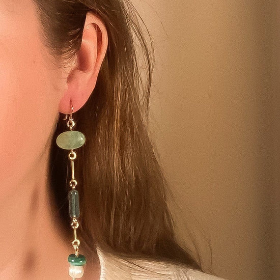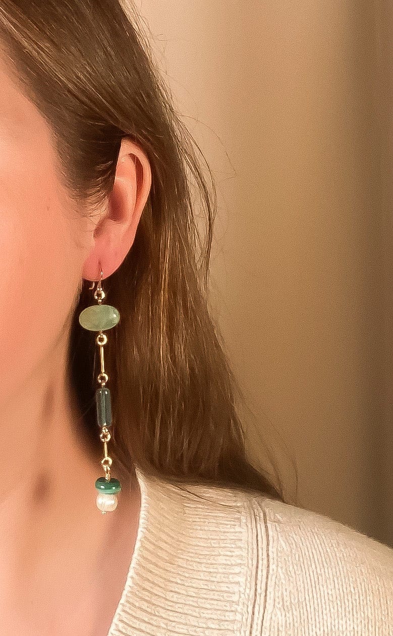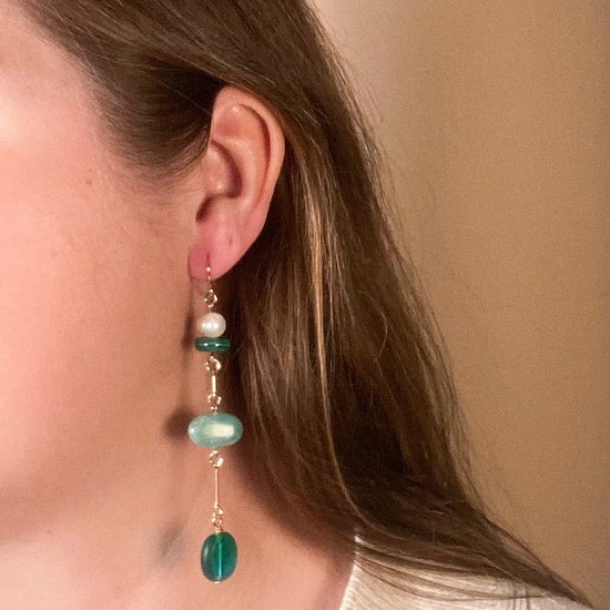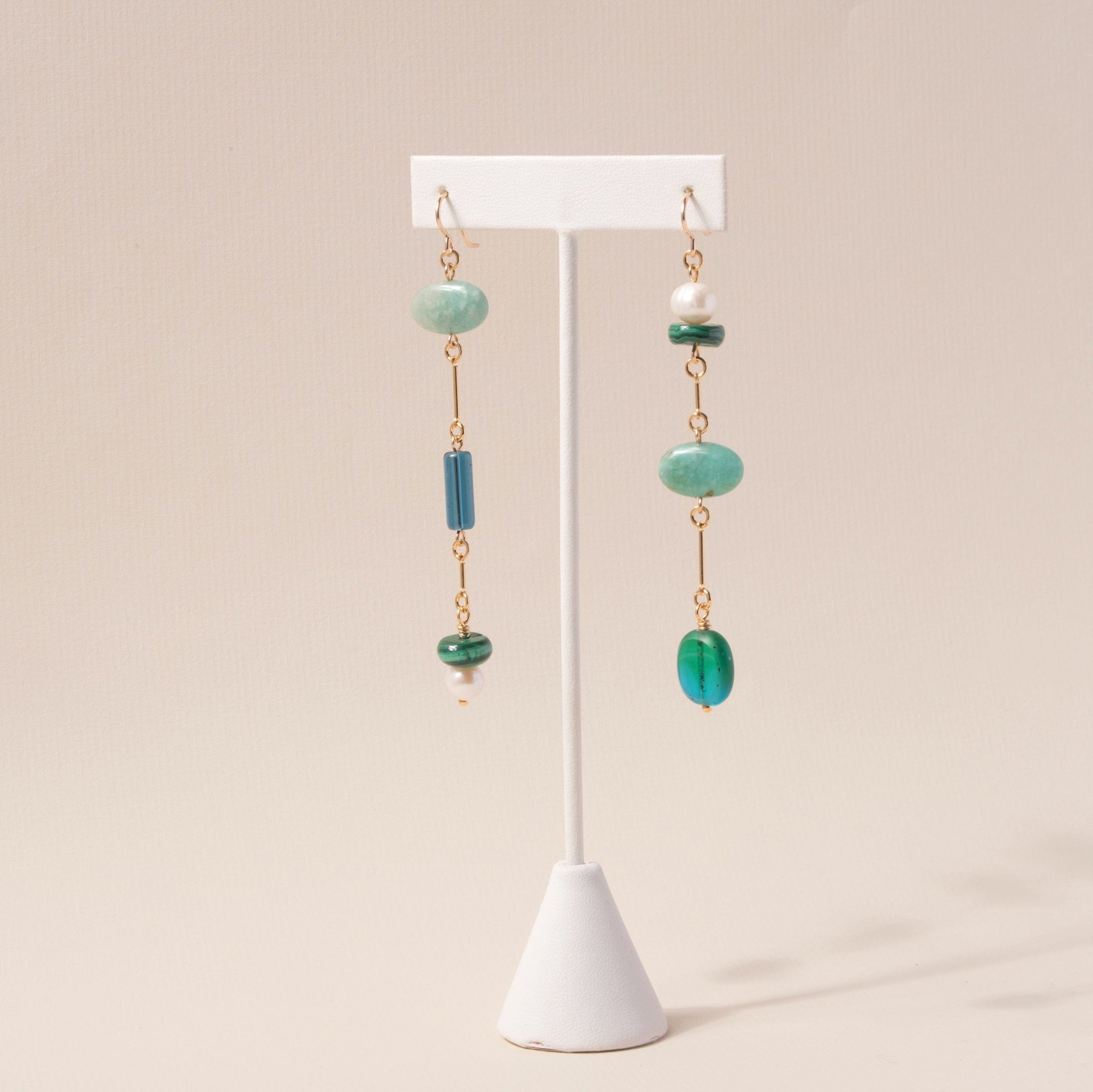 - Mismatched Earrings with Amazonite, Pearls, Malachite, and vintage glass