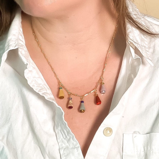 - Charm necklace with Lepidolite, Red Jasper, Amazonite, Crazy Lace Agate, and Yellow Jasper cone charms and glass tortoise charm