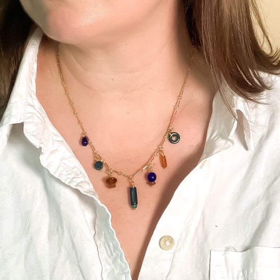 - Charm necklace with glass beads in light blue, topaz, and olive