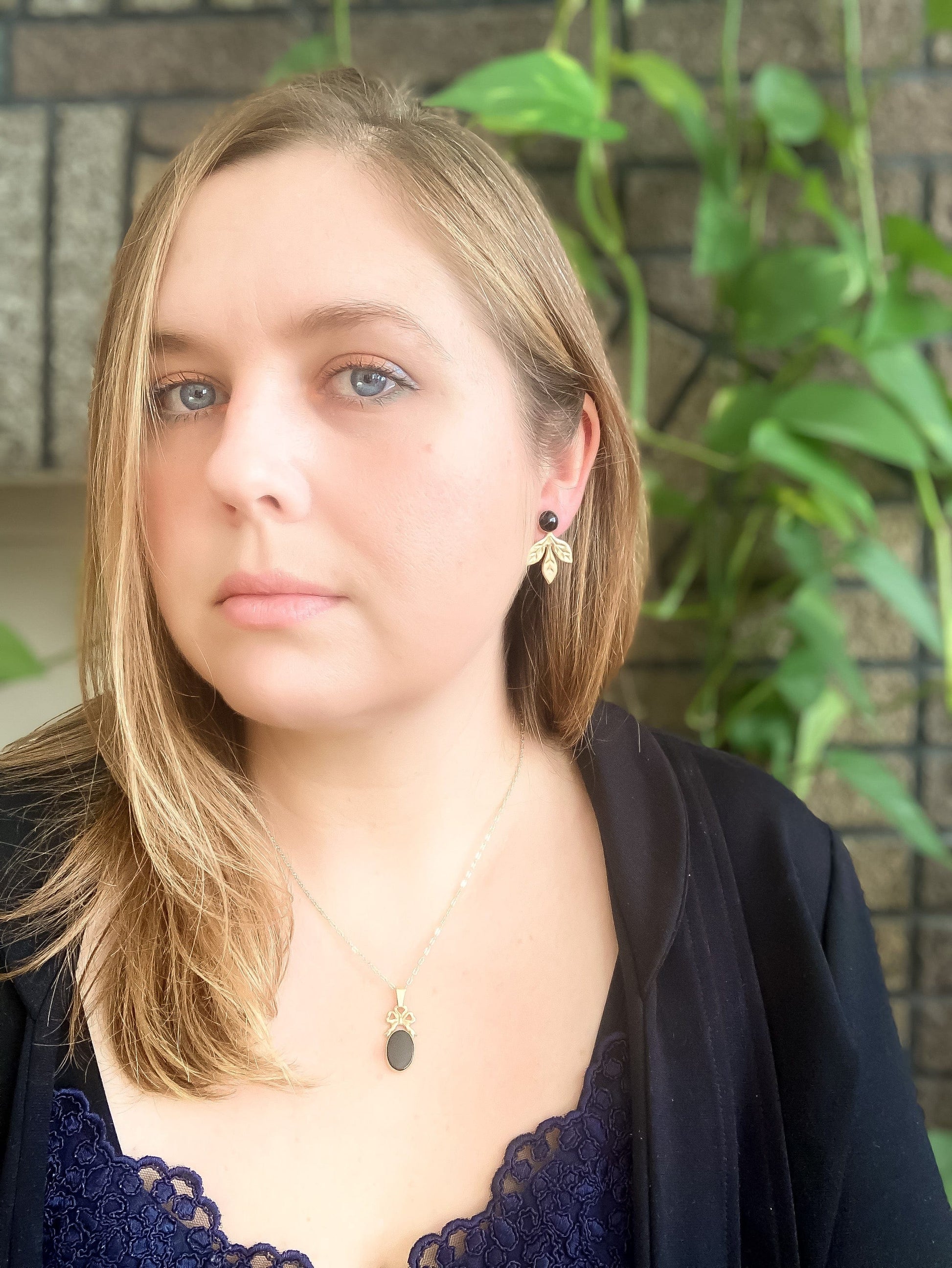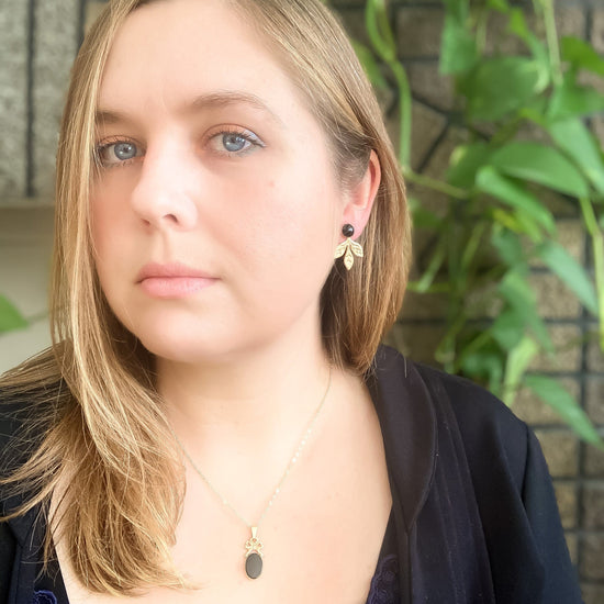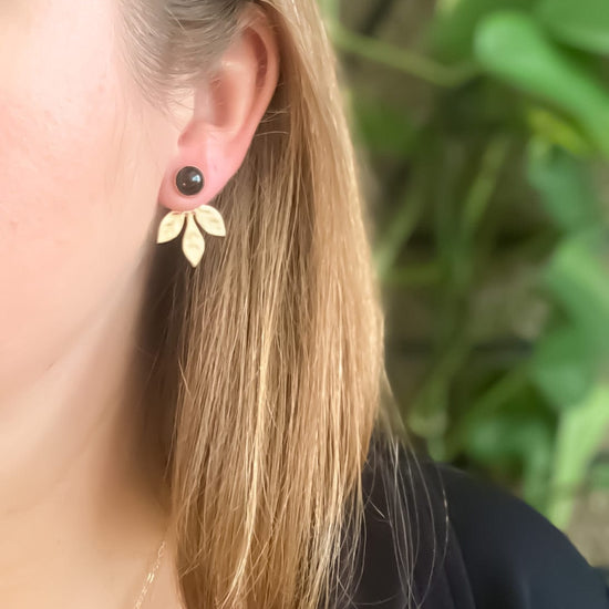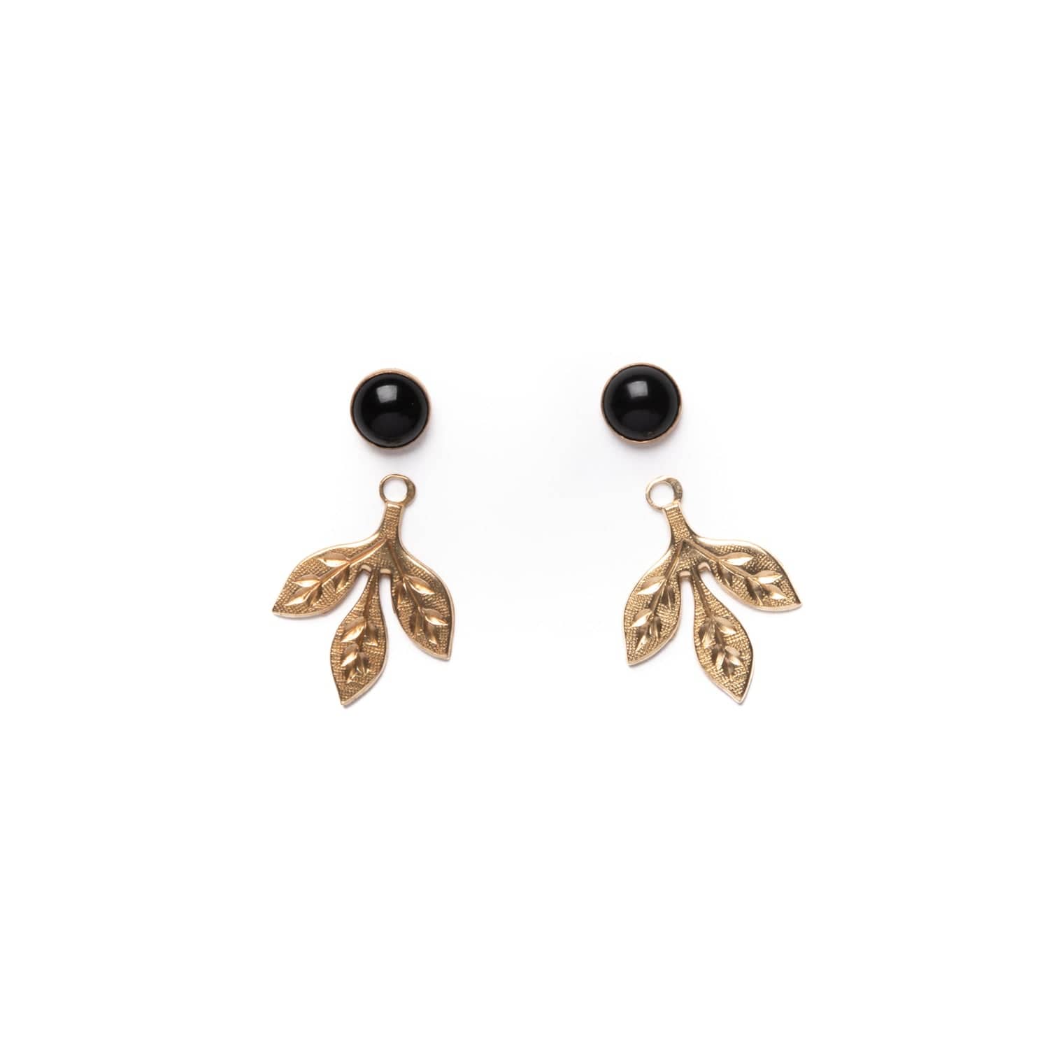 - Onyx cabochons set in brass settings with sterling silver posts and backs