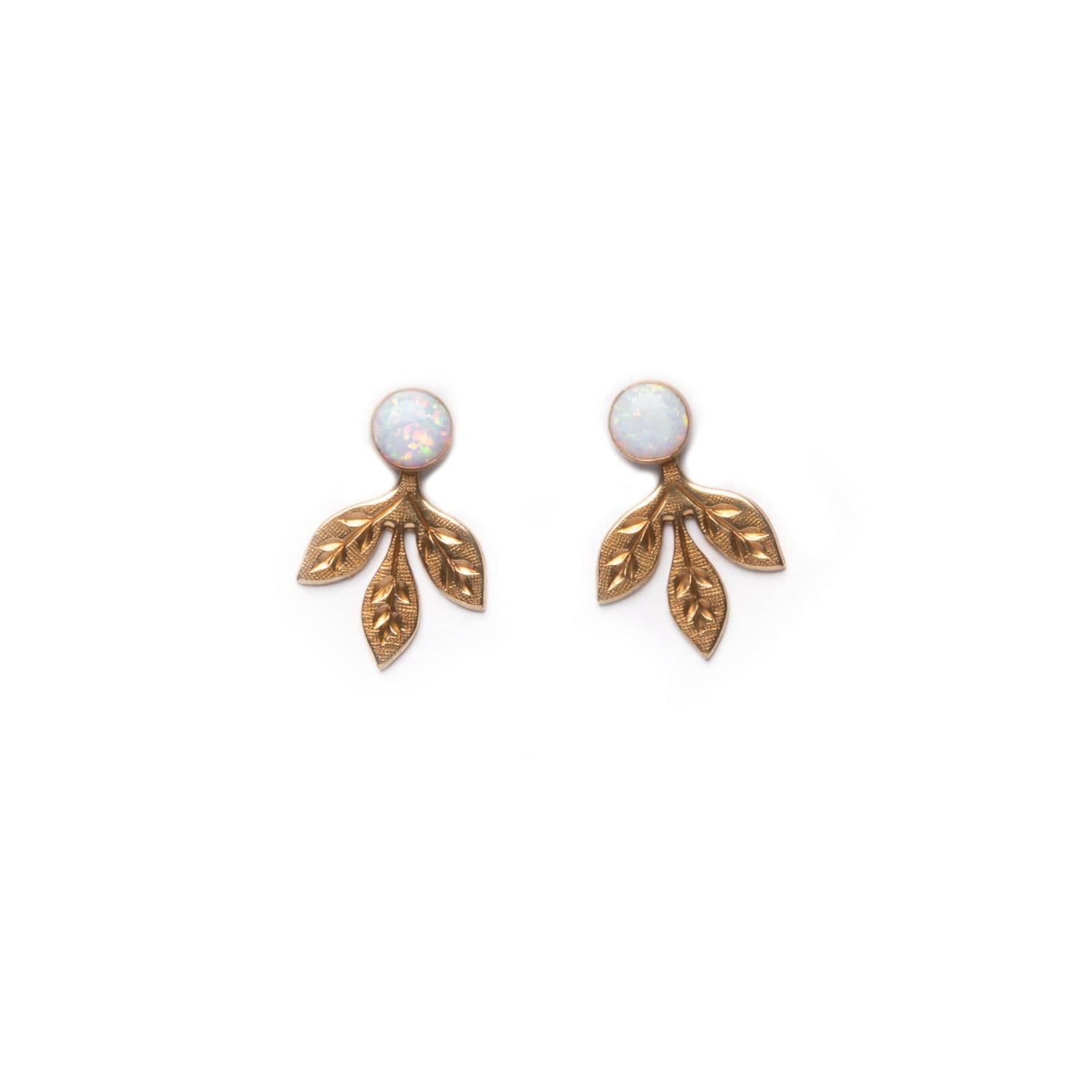 - Opal (lab created) cabochons set in brass settings with sterling silver posts and backs