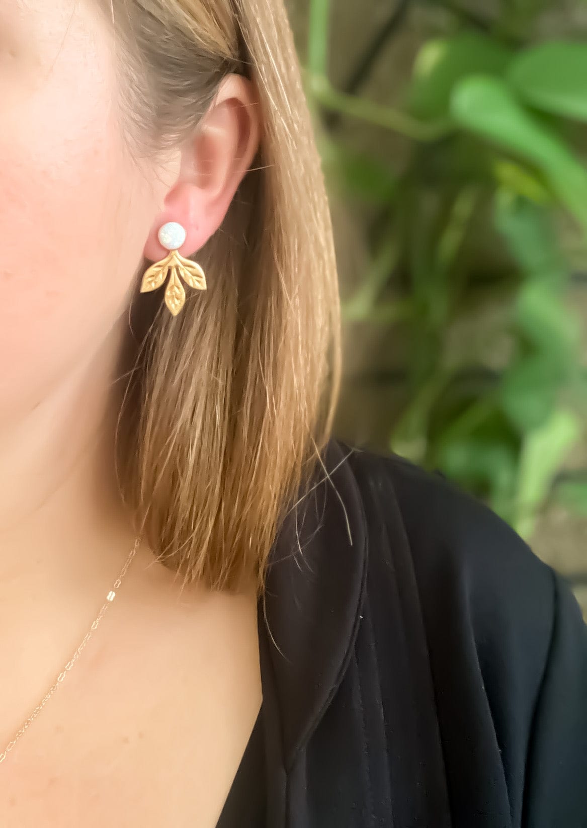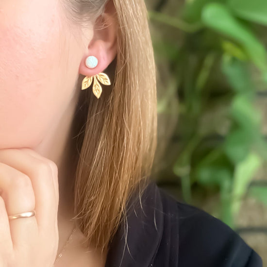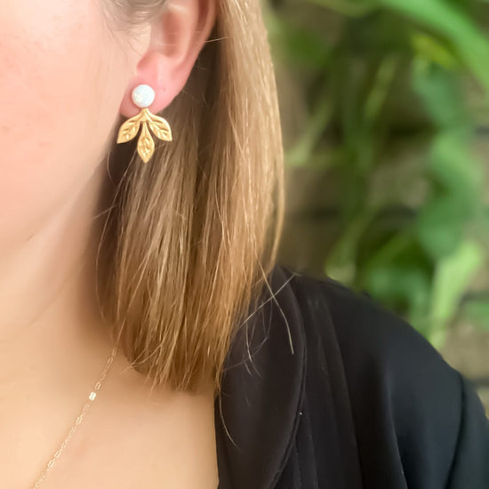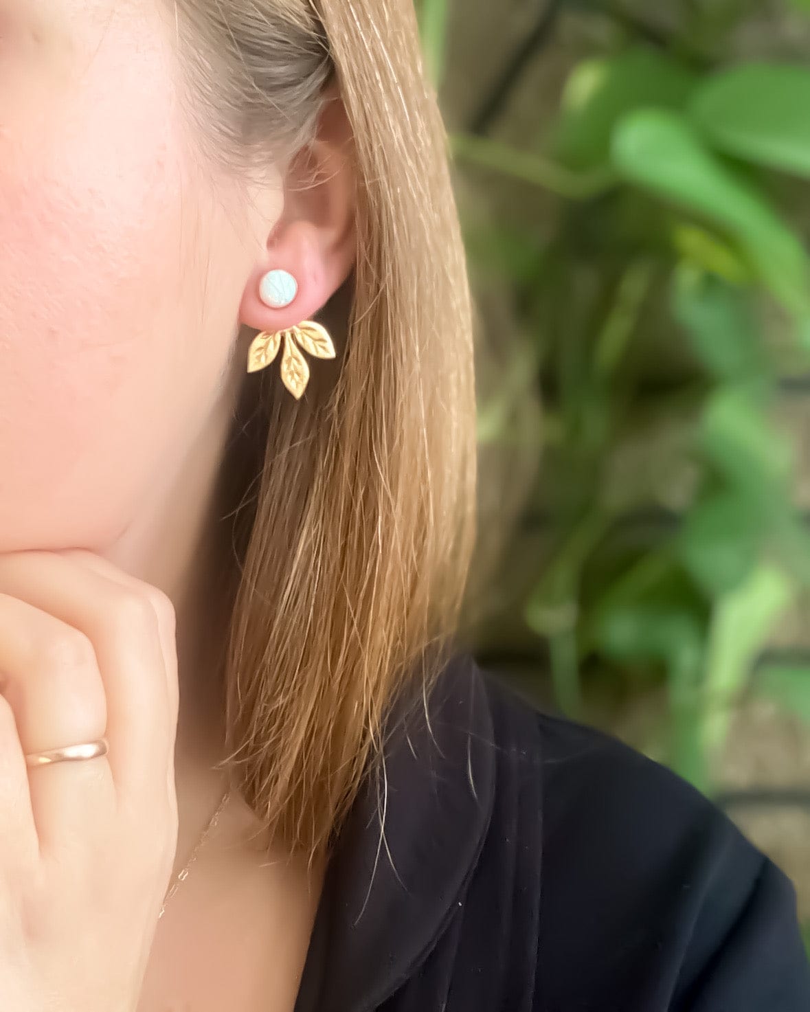 - Brass engraved leafy cutouts with a ring on top for hanging on ear posts