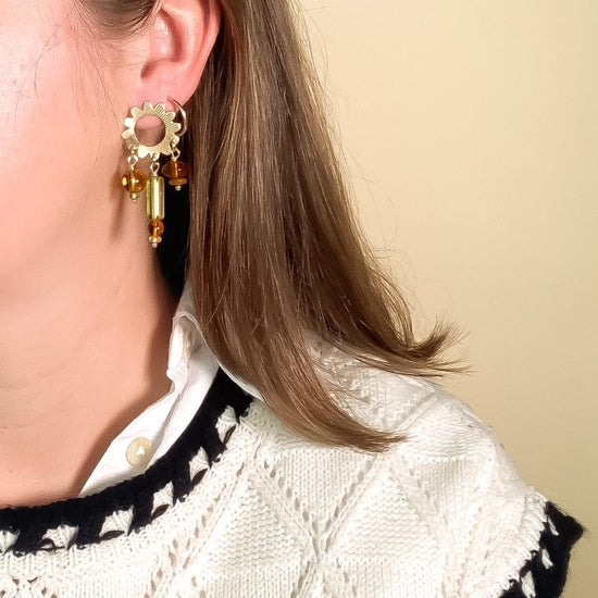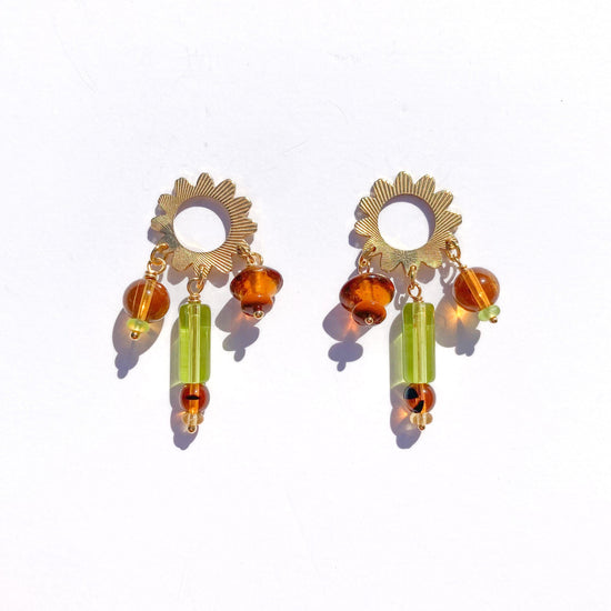 Flower Charm Earrings with Olive + Topaz Glass Beads