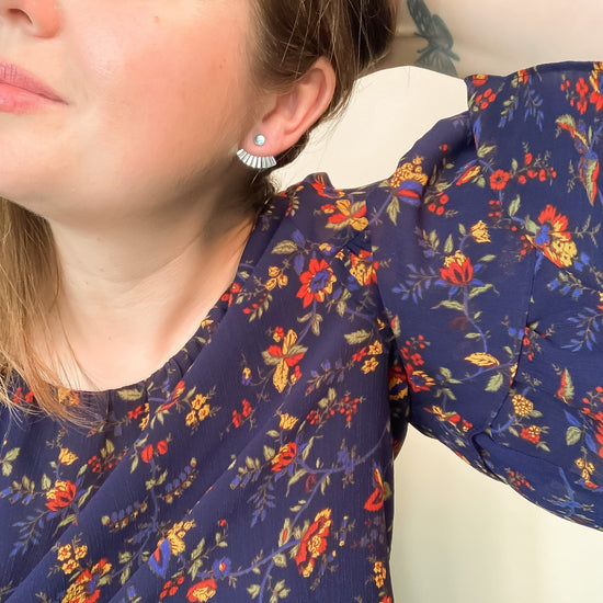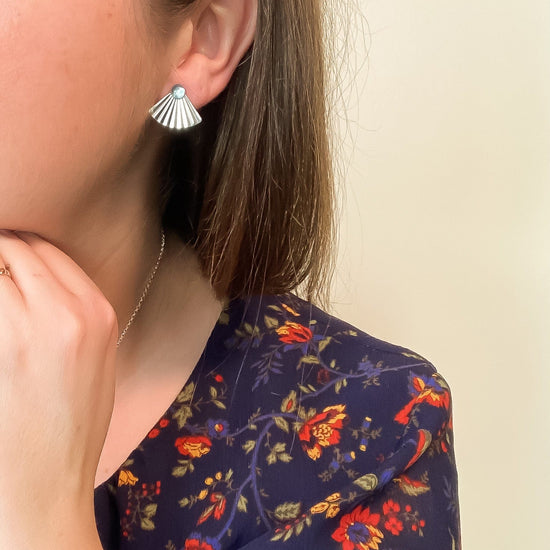Gold fill settings with Aquamarine cabochons. Gold fill posts and backs. Studs are 5mm. Gold fill fan shaped "mini pleat" earring jackets hang on the post of the earring and can be worn in front or behind the earlobe.