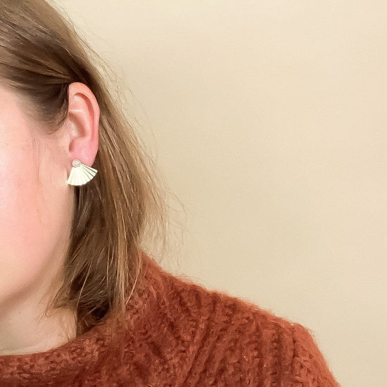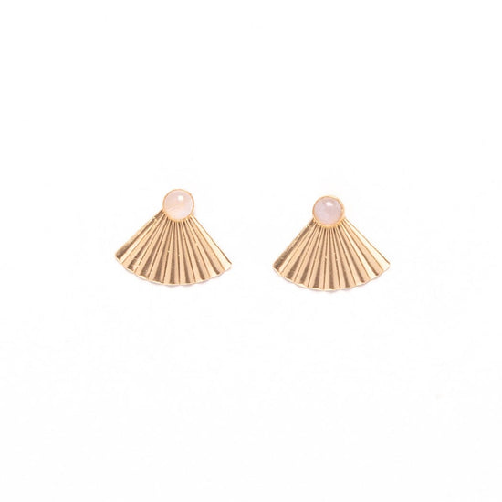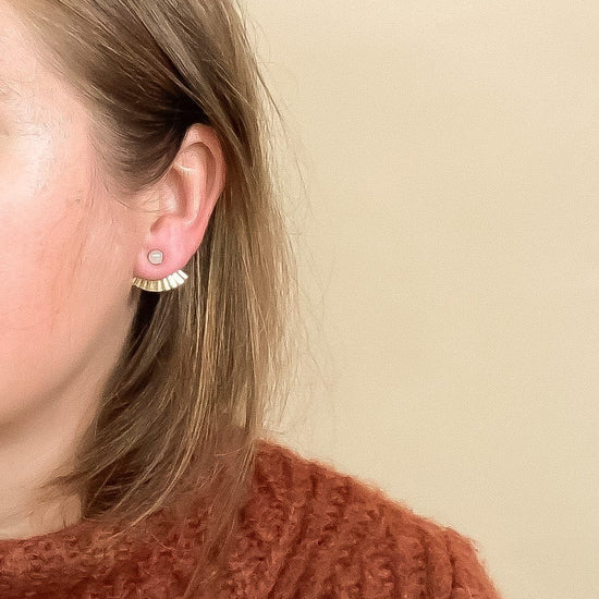 Gold fill settings with Blue Lace Agate cabochons. Gold fill posts and backs. Studs are 5mm. Gold fill fan shaped "mini pleat" earring jackets hang on the post of the earring and can be worn in front or behind the earlobe.