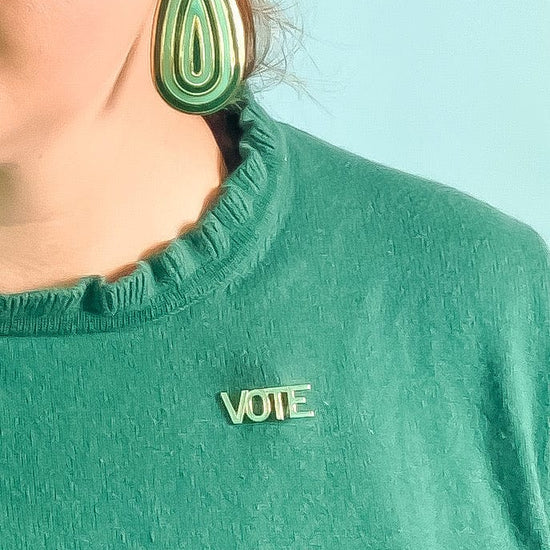 Brass Vote Pin with hand applied enamel resin in Jade. 3/8” x 1 1/8”. Brass tie tack with black rubber back.