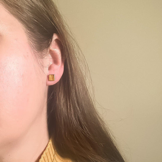- Circle Lapis and Square Tiger's Eye stones in brass settings