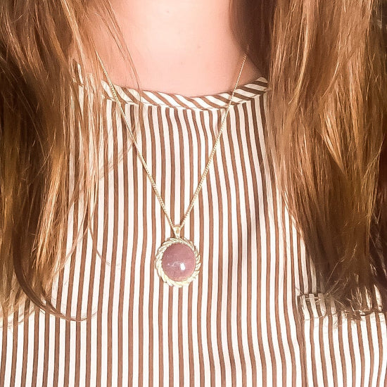 - Vintage laurel finding converted to bezel setting for a large round Strawberry Quartz cabochon (each stone is unique and will not look exactly like the photo)
