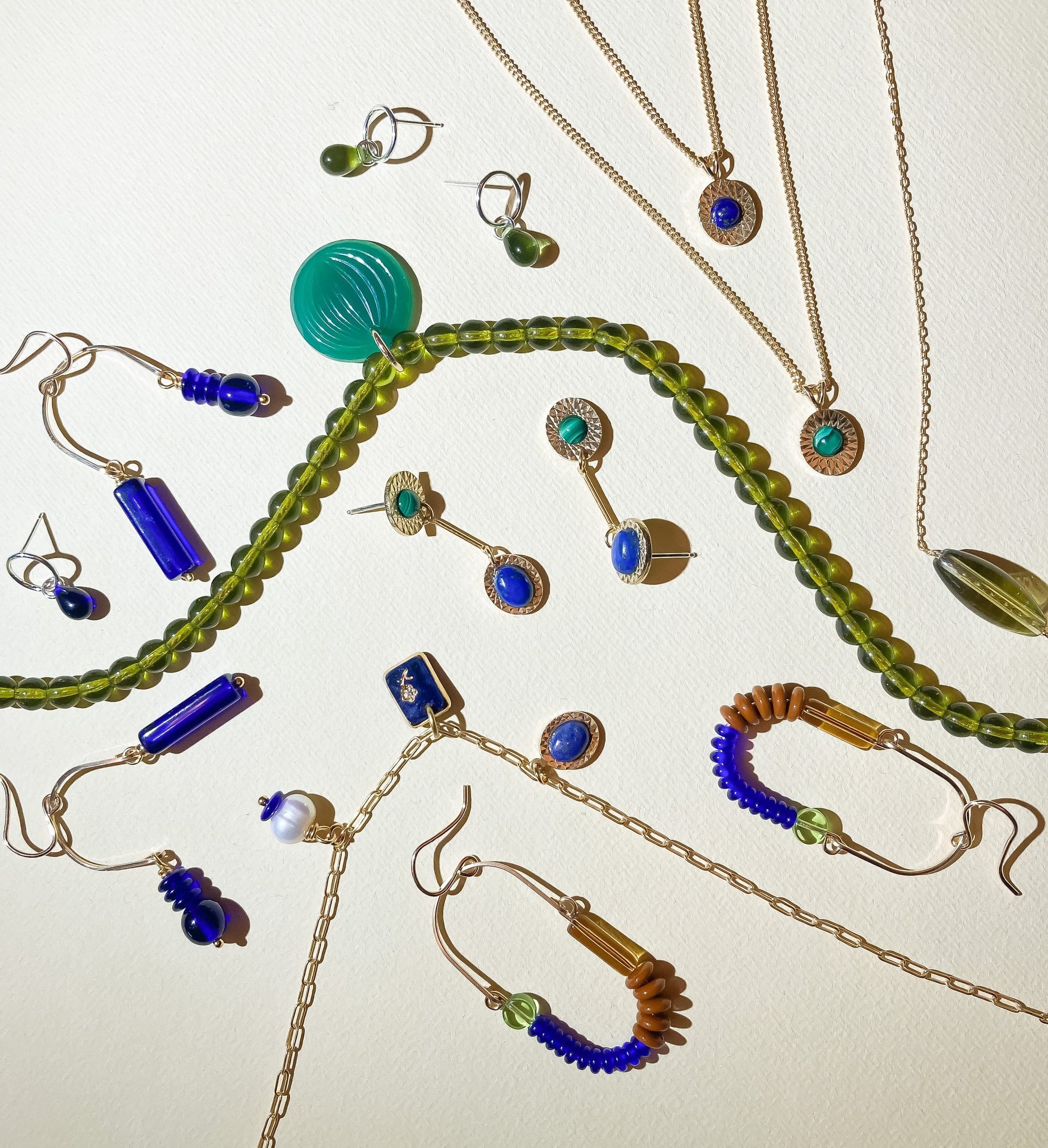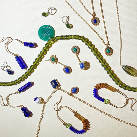 - Malachite round cabochons and Lapis oval cabochons