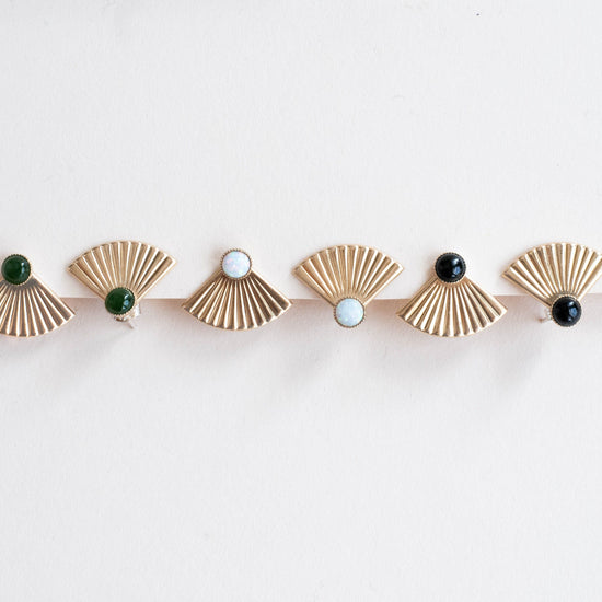 - Lab created Opal cabochons set in vintage brass bezels and vintage brass fan shaped jackets