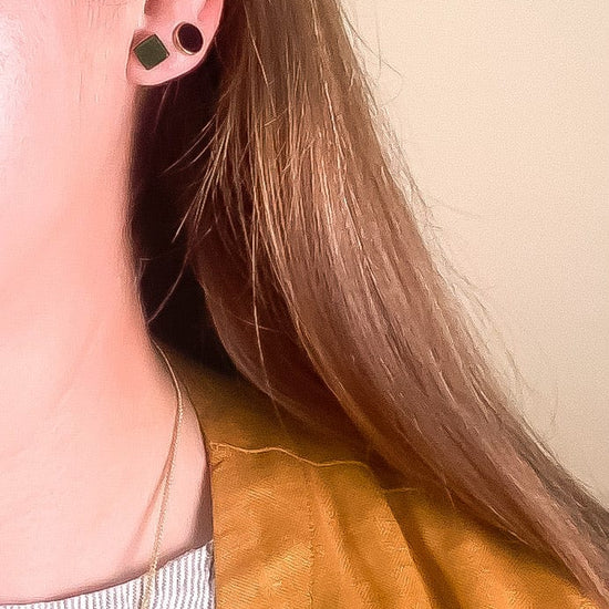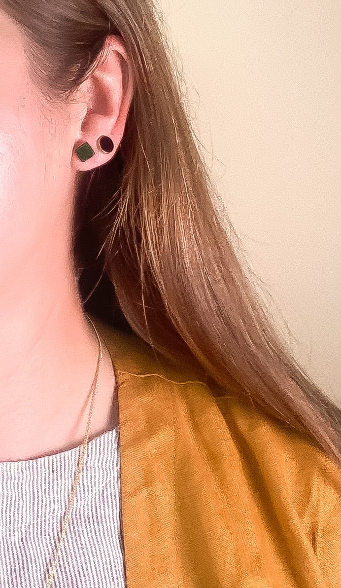 - Circle Onyx and Square Wyoming Jade stones in brass settings