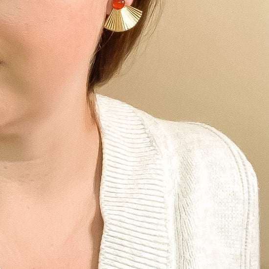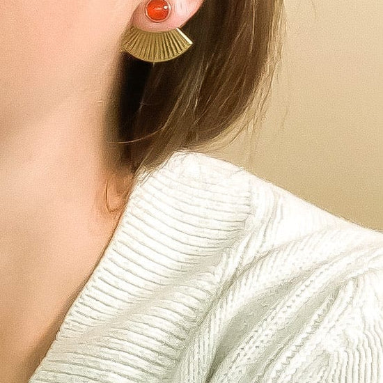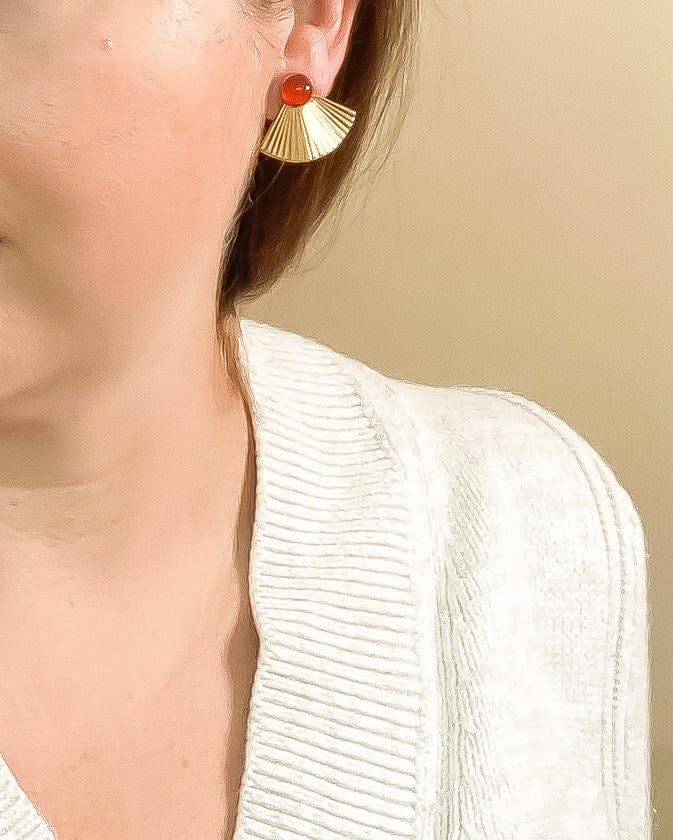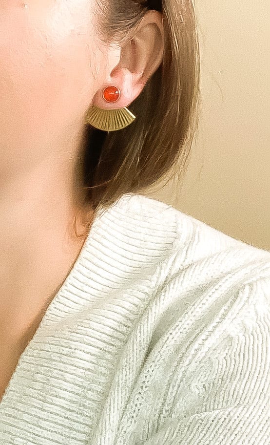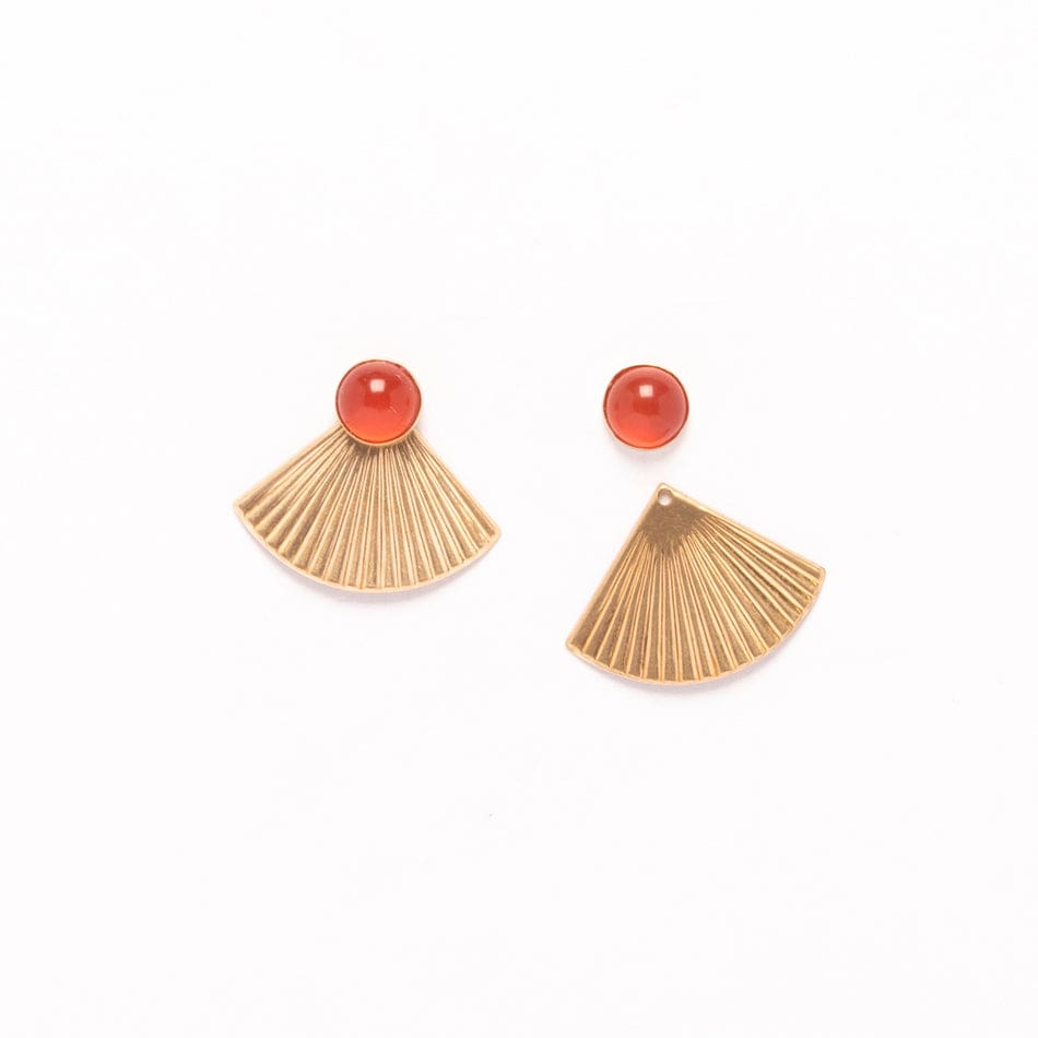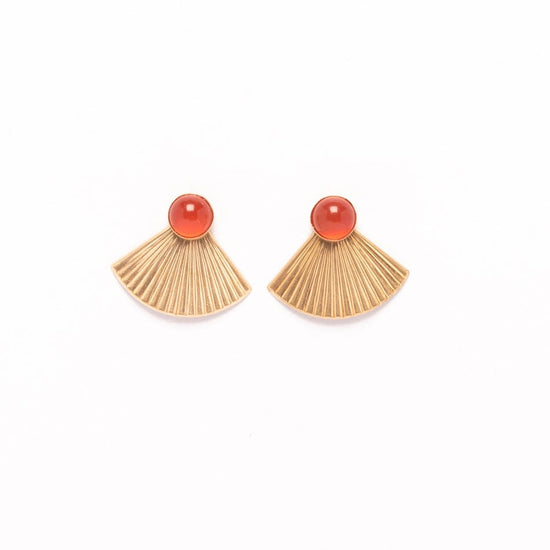 - Carnelian cabochons set in brass bezels with one pair of brass fan shaped pleated jackets