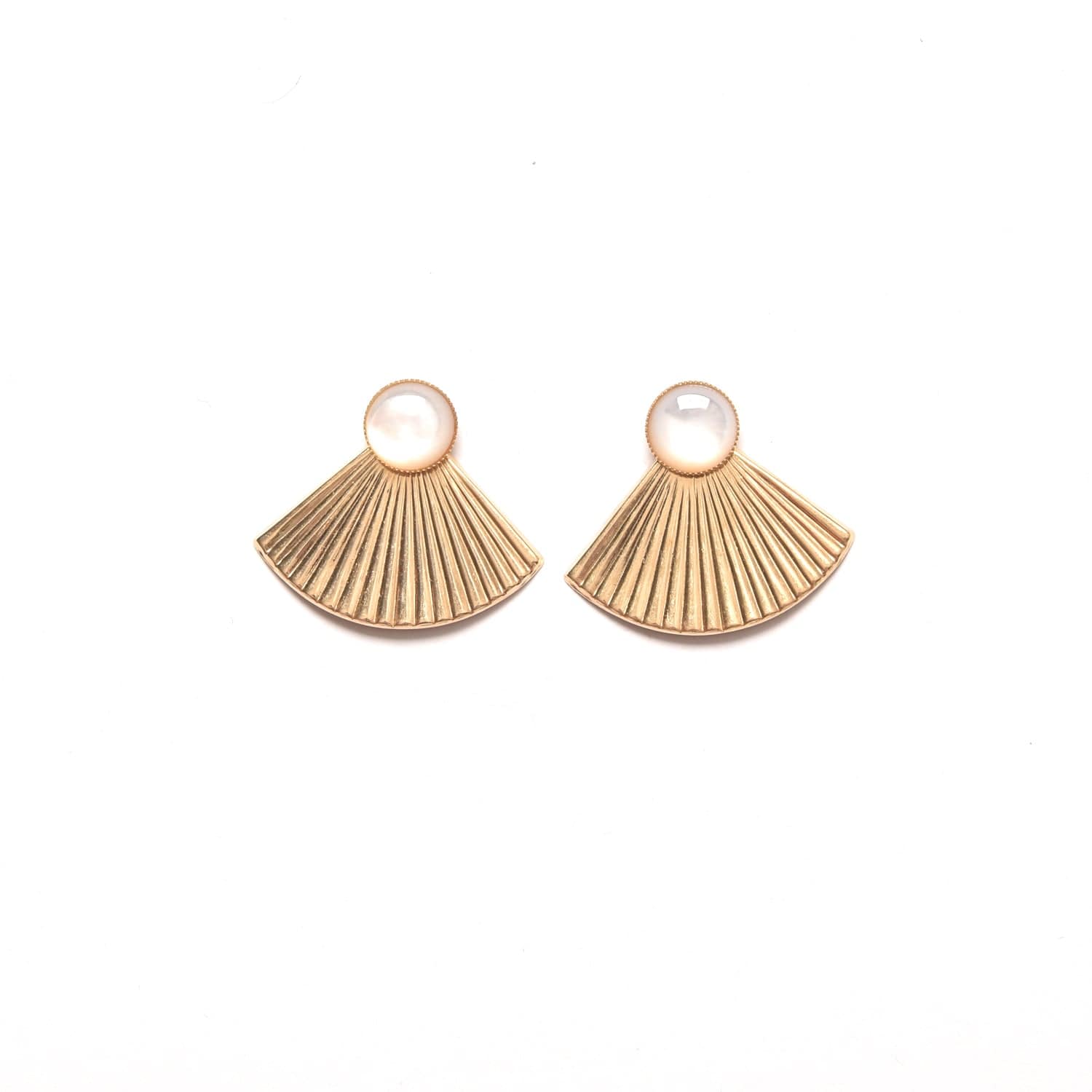 - Mother of Pearl cabochons set in brass bezels with one pair of brass fan shaped pleated jackets