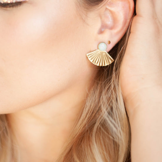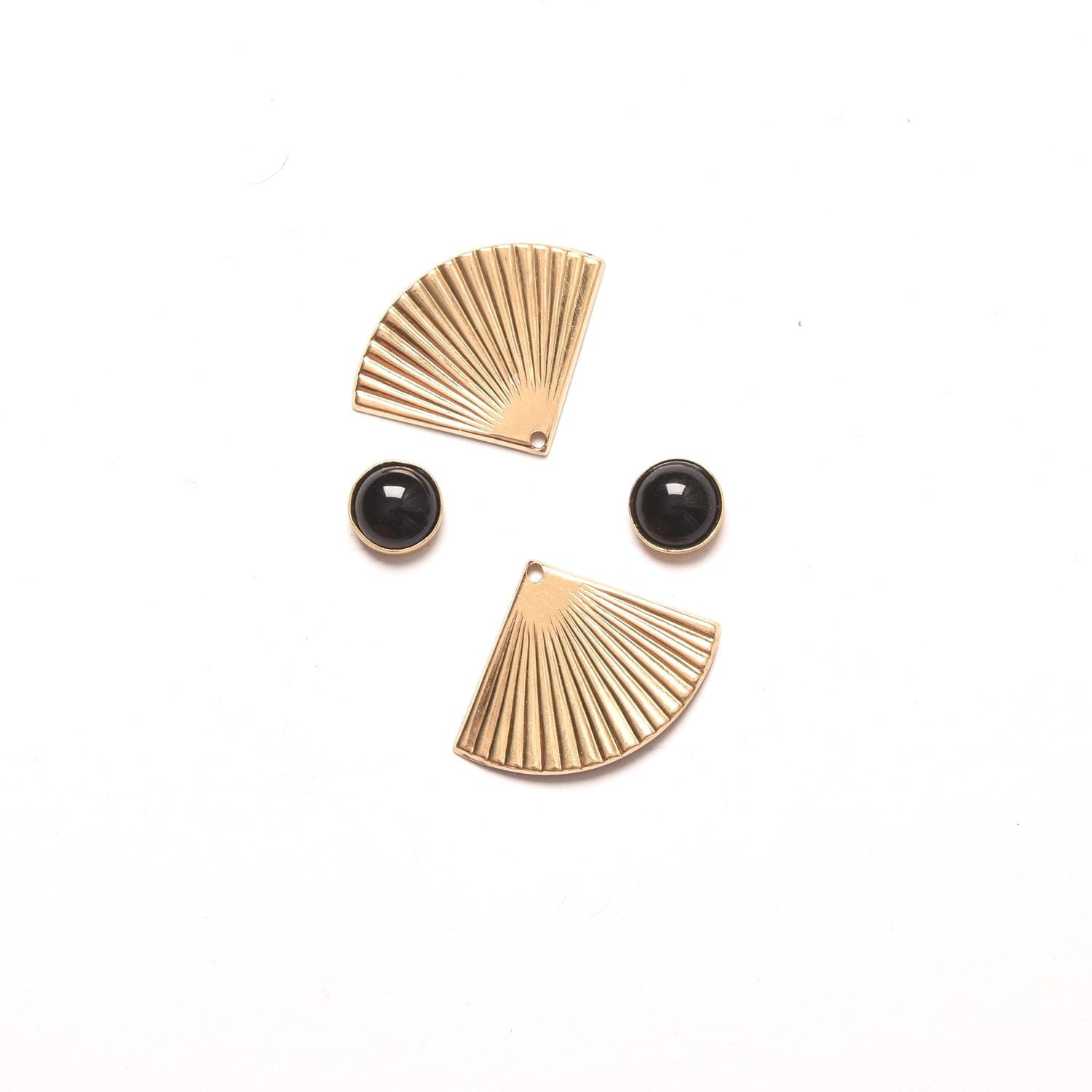 - Onyx cabochons set in brass bezels with one pair of brass fan shaped pleated jackets