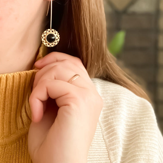 - Checkered brass stampings with a rolled edge setting in the center and Onyx cabochons
