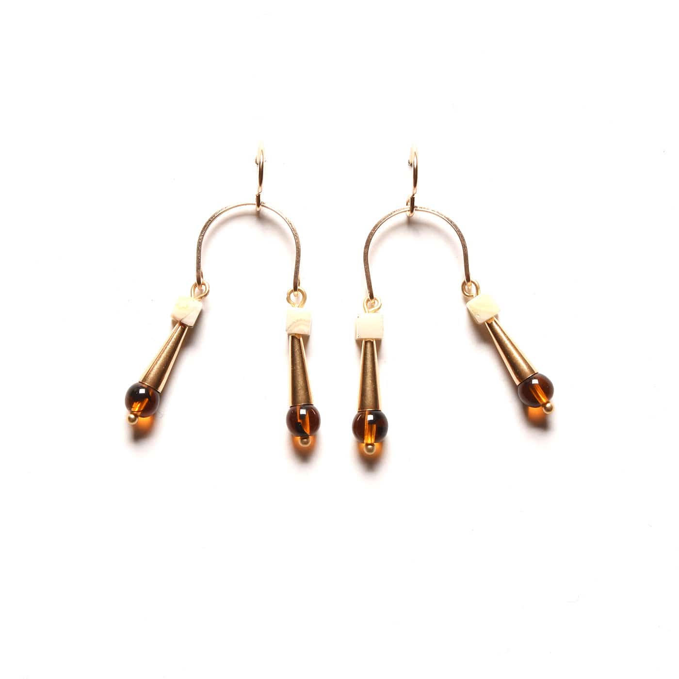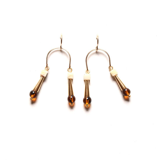 Inspired by a visit to Frank Lloyd Wright's home and studio in Oak Park. The combination of the round bead, brass cone, and square bead comes from the banisters in the play room.