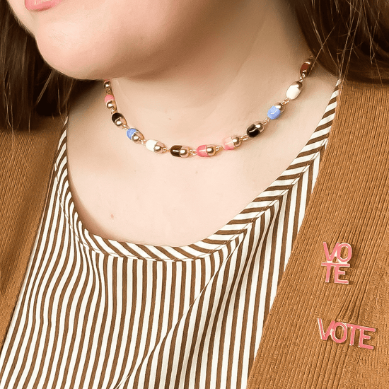 Vertical brass Vote Pin with hand applied enamel resin in Hot Pink.  1/2” x 3/4”.  Brass tie tack with black rubber back.