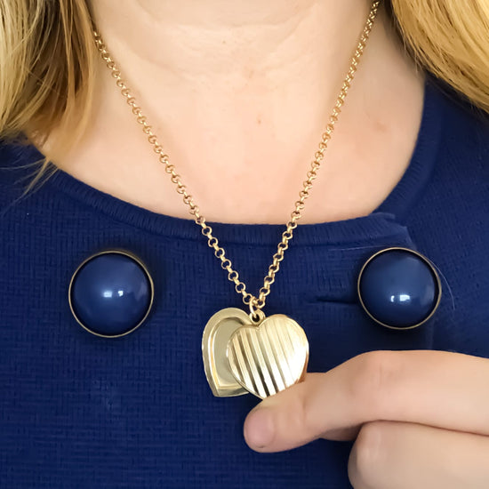 Vintage striped brass heart locket that slides open. Nickel free matte gold plated brass chain. 18" long. Heart is 1" x 1 1/4".