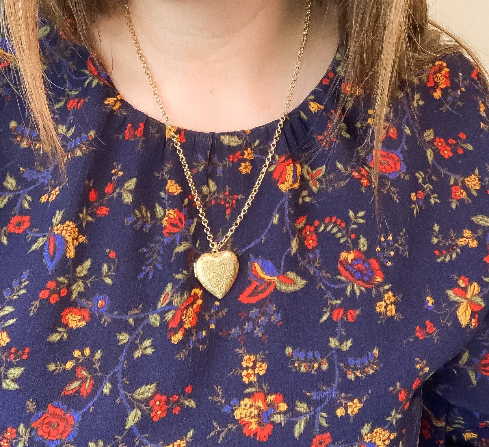 Vintage brass textured heart shaped locket. Space for 2 photos on the inside. I would use glue dots or craft glue to attach the photos. Locket is 1" x 1".